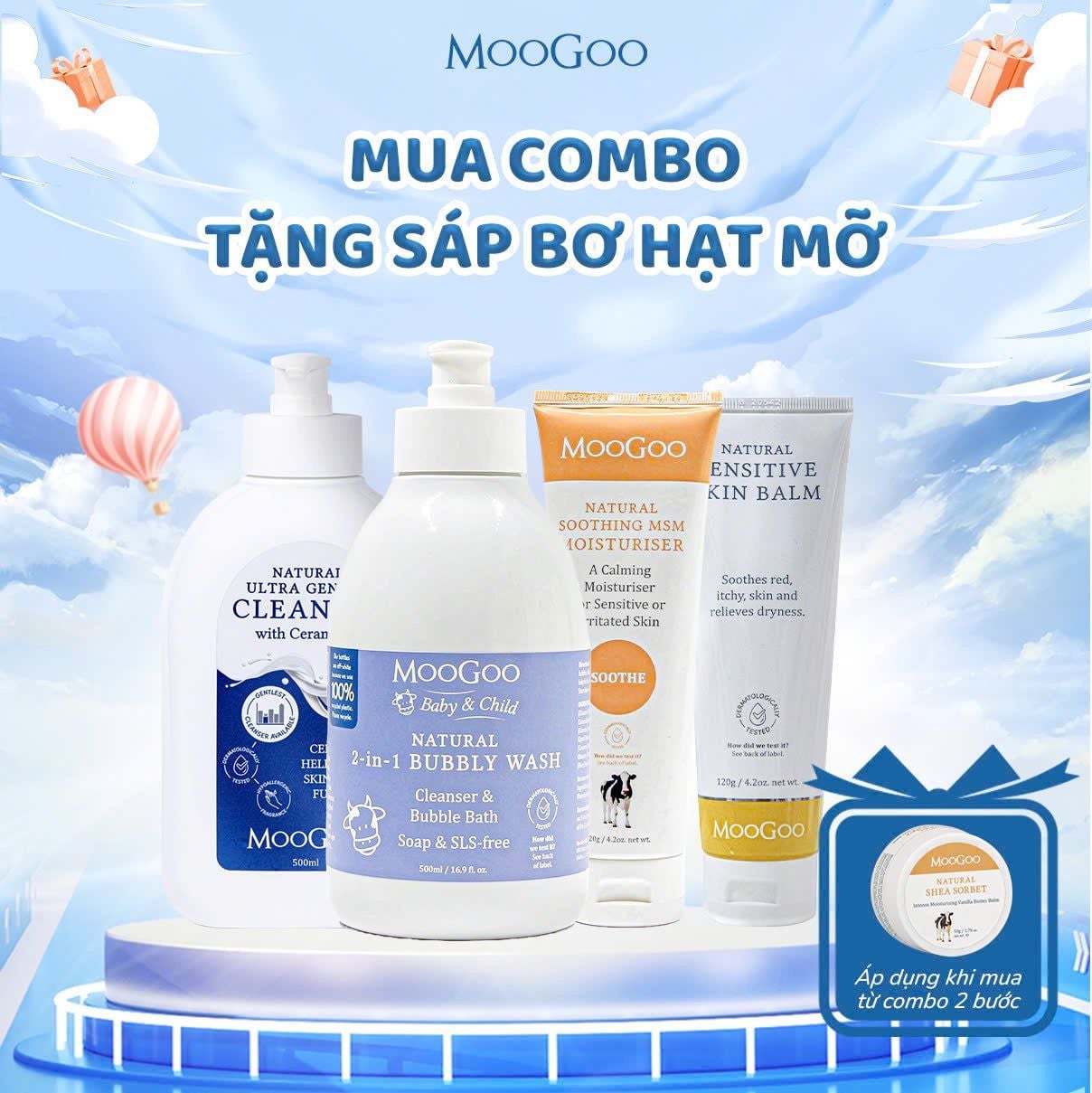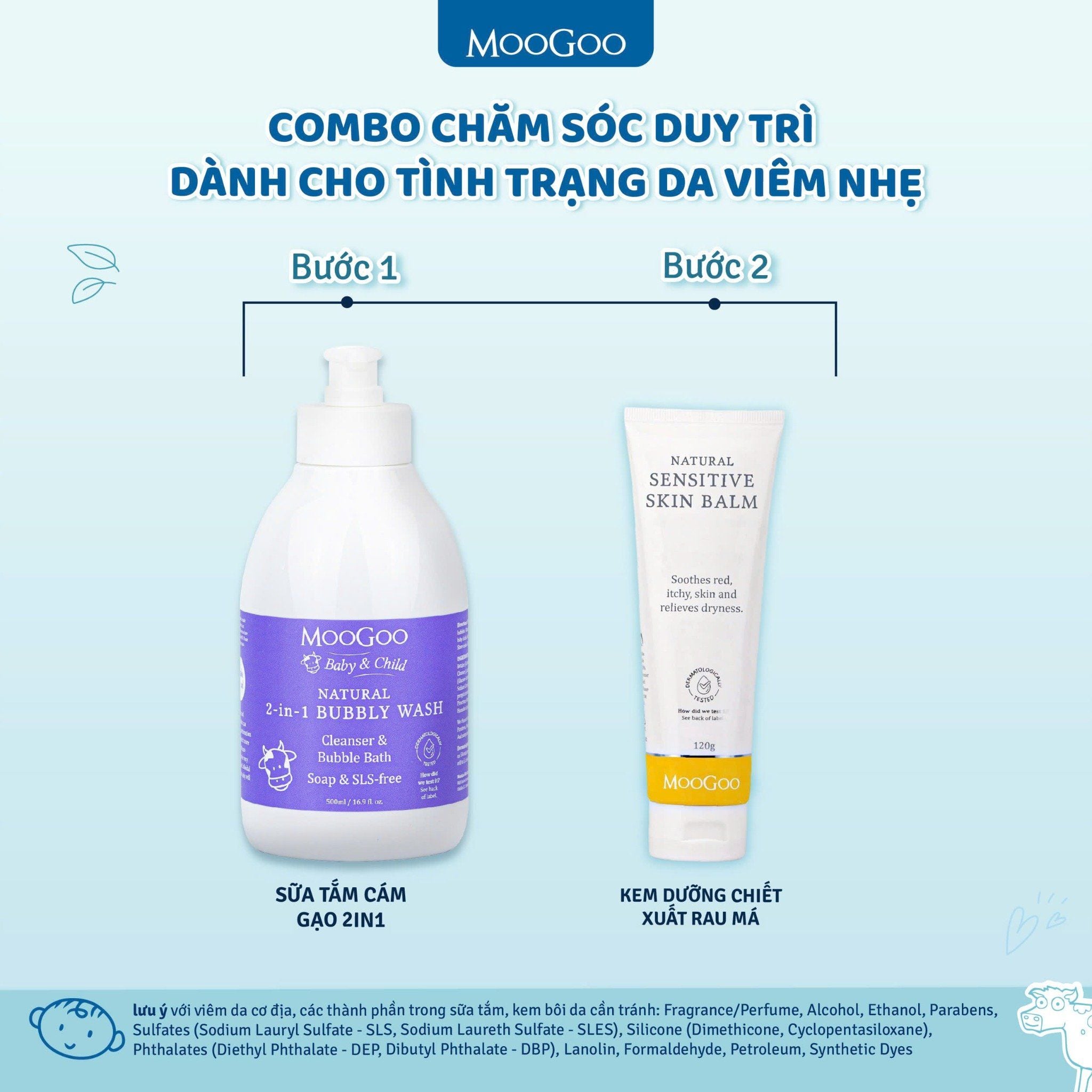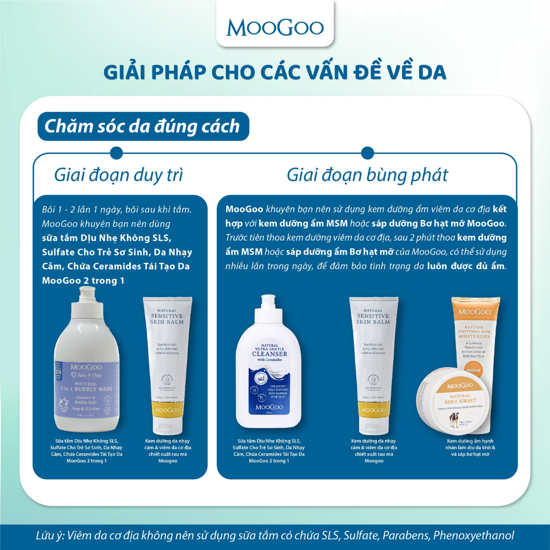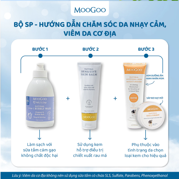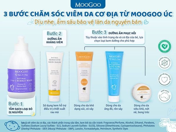 Combo 3 bước chăm sóc da viêm da cơ địa MooGoo là giải pháp chăm sóc da toàn diện, an toàn và lành tính cho cả người lớn lẫn trẻ sơ sinh. Bộ sản phẩm được thiết kế theo quy trình 3 bước khoa học: