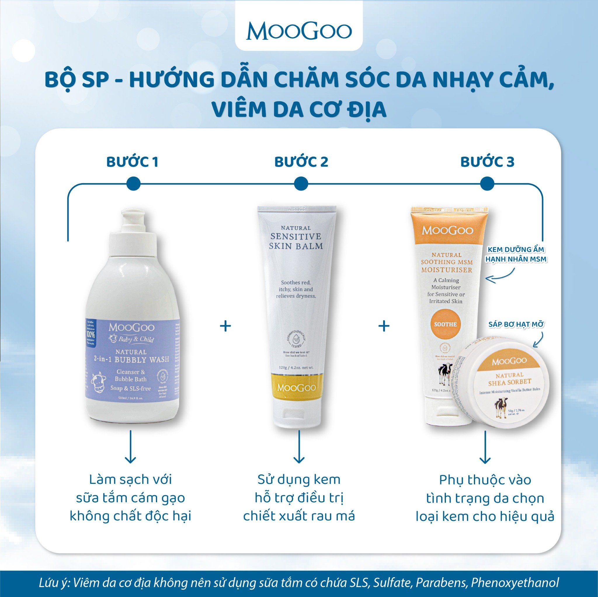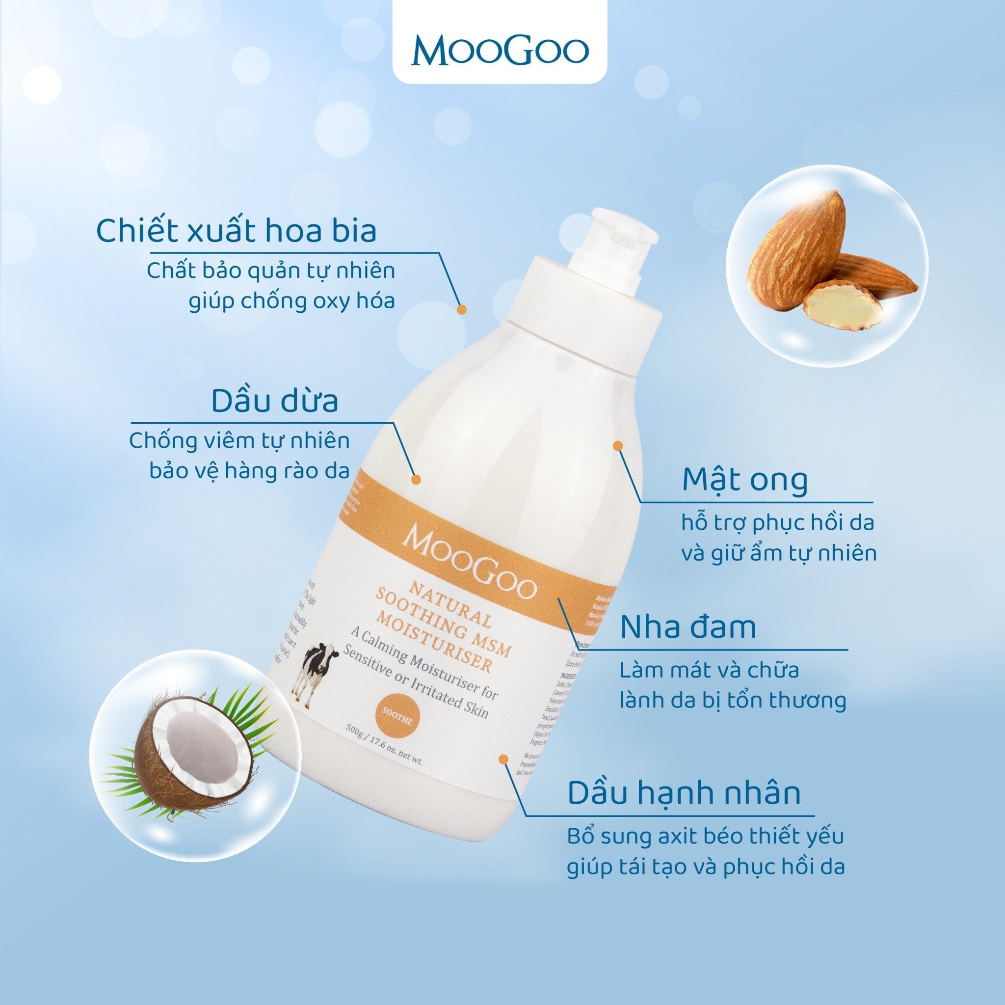 Một loại kem dưỡng ẩm đặc biệt, dành riêng cho những làn da nhạy cảm. Chúng tôi thấu hiểu rõ nỗi đau đáng buồn mà những người sở hữu làn da nhạy cảm phải đối mặt khi mà mọi tác động từ bên ngoài có thể khiến da trở nên kích ứng. Kem dưỡng da nhẹ nhàng này được tạo nên từ những thành phần của Kem Dưỡng Full Cream của MooGoo, với thành phần giàu axit béo thiết yếu cho sự khỏe mạnh của làn da và được được sử dụng cho những làn da dễ bị kích ứng.